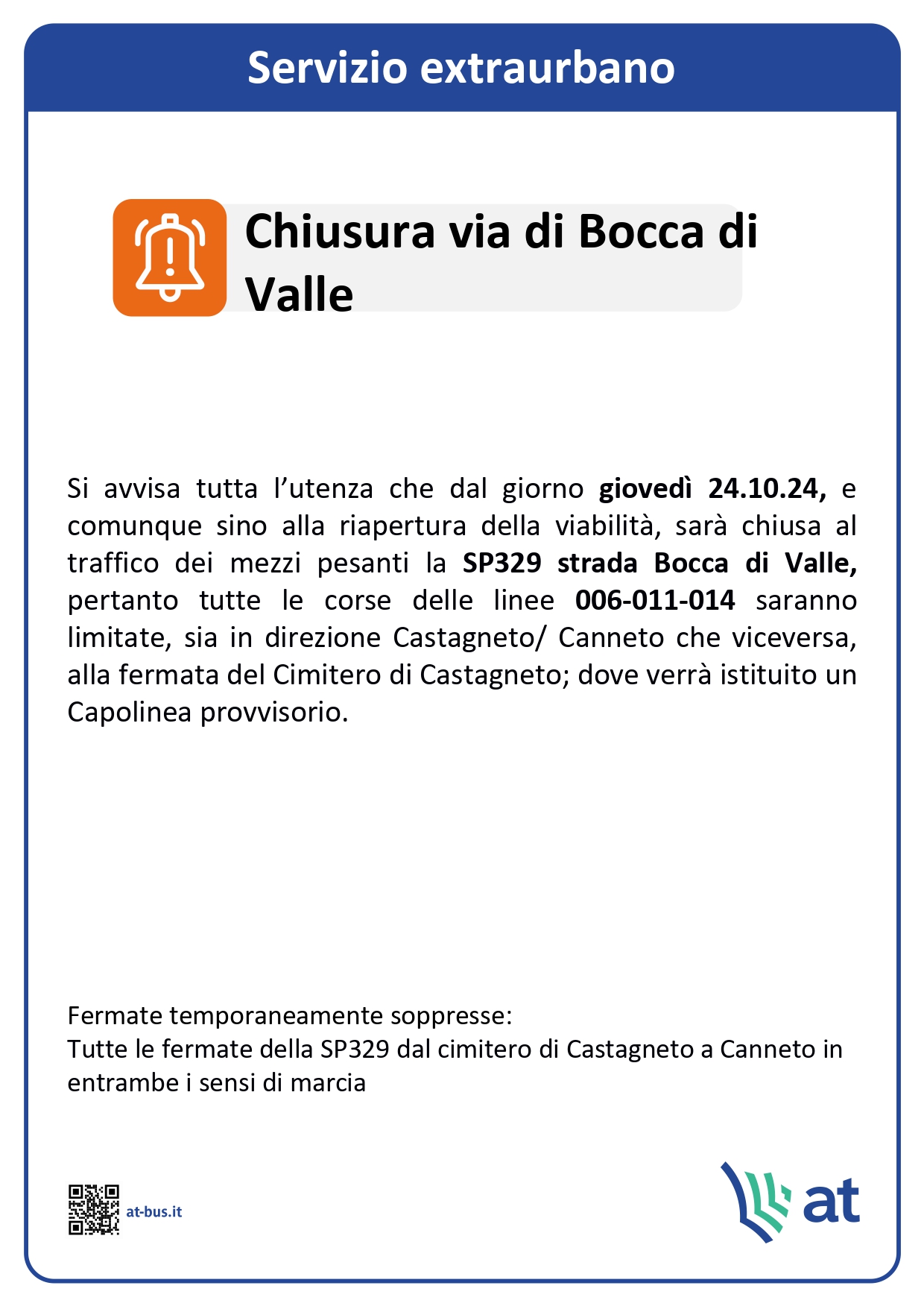 Si avvisa tutta l’utenza che dal giorno giovedì 24.10.24, e comunque sino alla riapertura della viabilità, sarà chiusa al traffico dei mezzi pesanti la SP329 strada Bocca di Valle, pertanto tutte le corse delle linee 006-011-014 saranno limitate, sia in direzione Castagneto/ Canneto che viceversa, alla fermata del Cimitero di Castagneto; dove verrà istituito un Capolinea provvisorio.