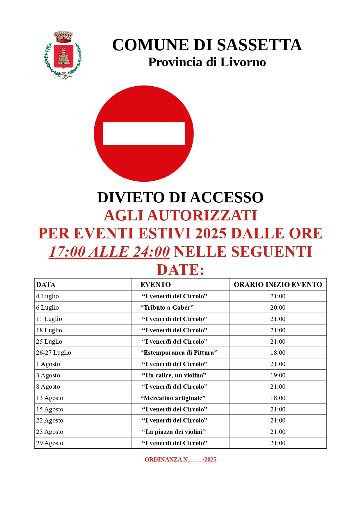 PER EVENTI ESTIVI 2025 DALLE ORE 17:00 ALLE 24:00 NELLE SEGUENTI DATE: