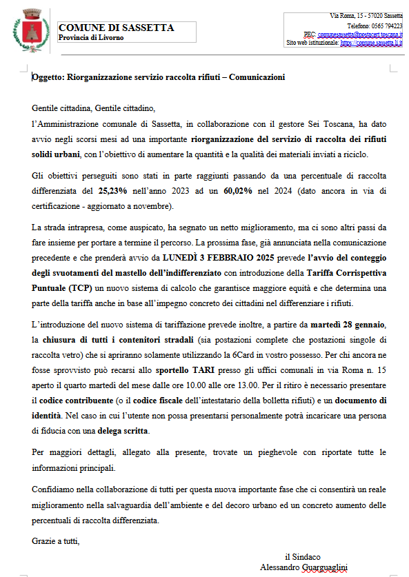 Da martedì 28 gennaio 2025 tutti i contenitori stradali verranno chiusi, mentre da lunedì 3 febbraio 2025 inizierà il conteggio degli svuotamenti del mastello dell'indifferenziato.